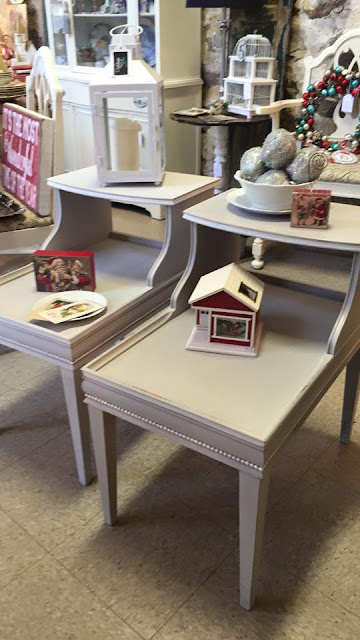 And while I was in a mid-century mood, I refreshed this pair of mid-century end tables that the Hubs brought home. I chose gray chalk paint to keep the palette in the shop neutral for the holidays.